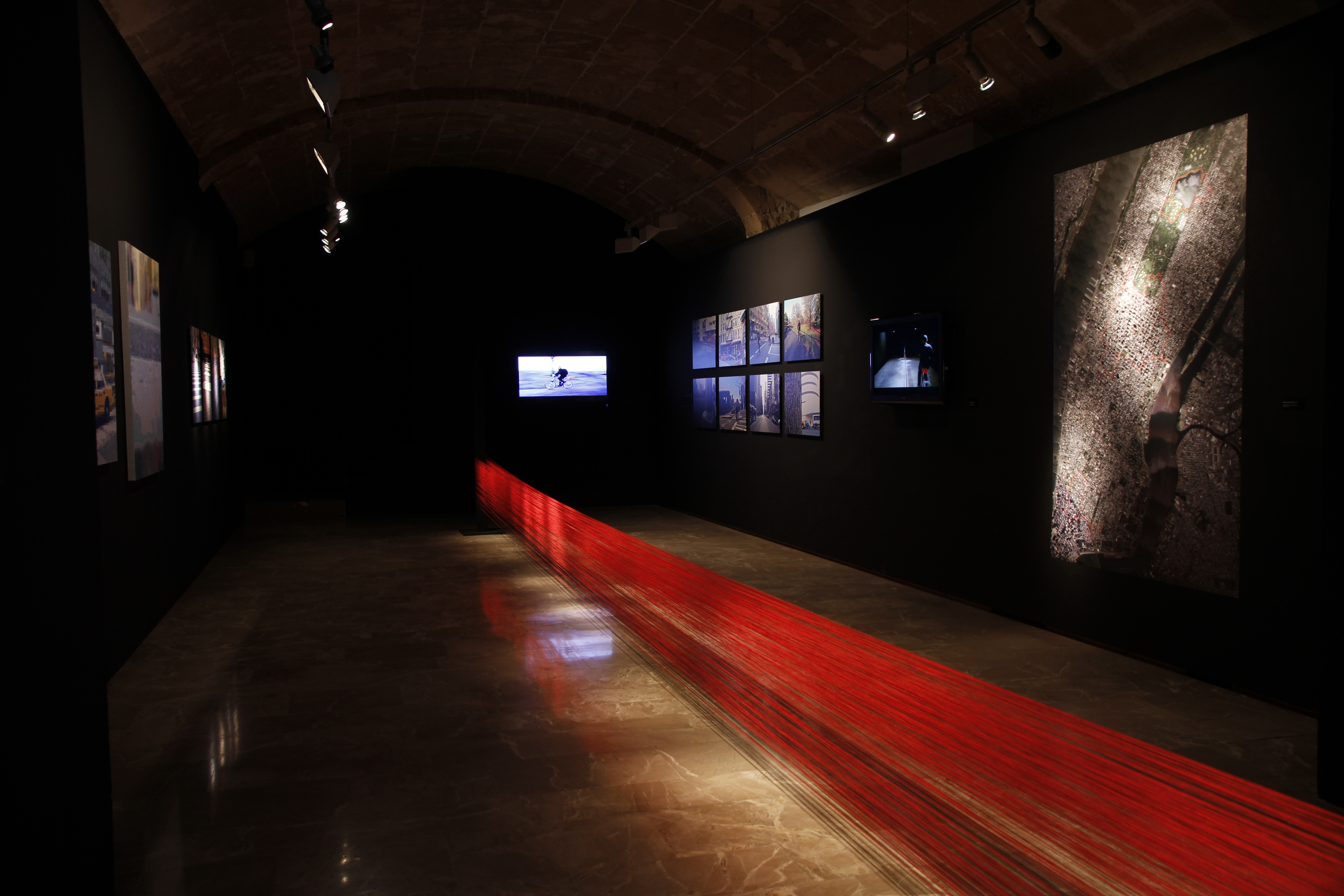 Acting like Joseph Kosuth with his three different “chairs” (the real one, that dictionary definition, and the written one), Jaume Orejuela also takes advantage of that ready-made bicycle that presides the entrance to the gallery in another act of repetition, putting on canvas the triple image of that “Duchampian vehicle”: the object-based one, the photographic one, and the video documentaries of his New York itinerary which the performance “Replica” recreates in the gallery (resulting in forty kilometres of red thread in the centre of the installation).